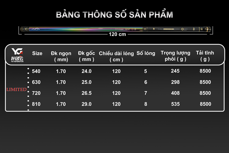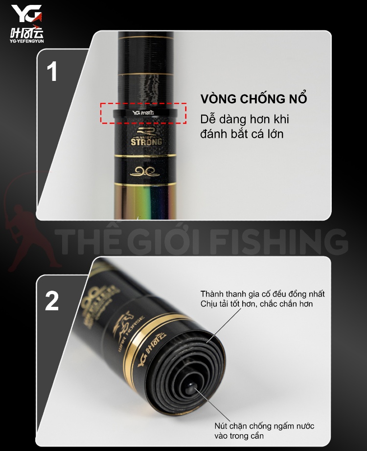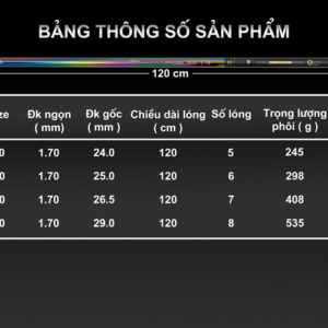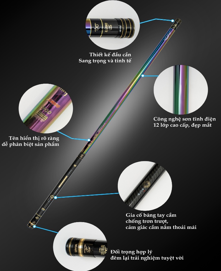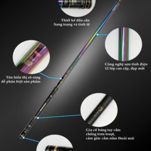 – Công nghệ sơn tĩnh điện 7 màu nhiều lớp cao cấp, đẹp mắt. Thiết kế thông minh, chống bó kẹt lóng khi ra cần, vòng chống nổ chất liệu hợp kim cao cấp dễ dàng hơn khi đánh bắt cá lớn.
